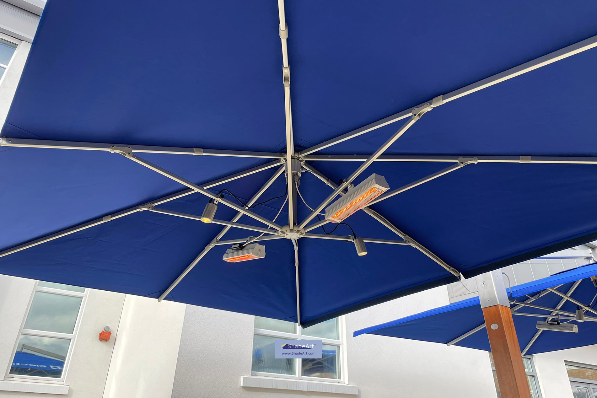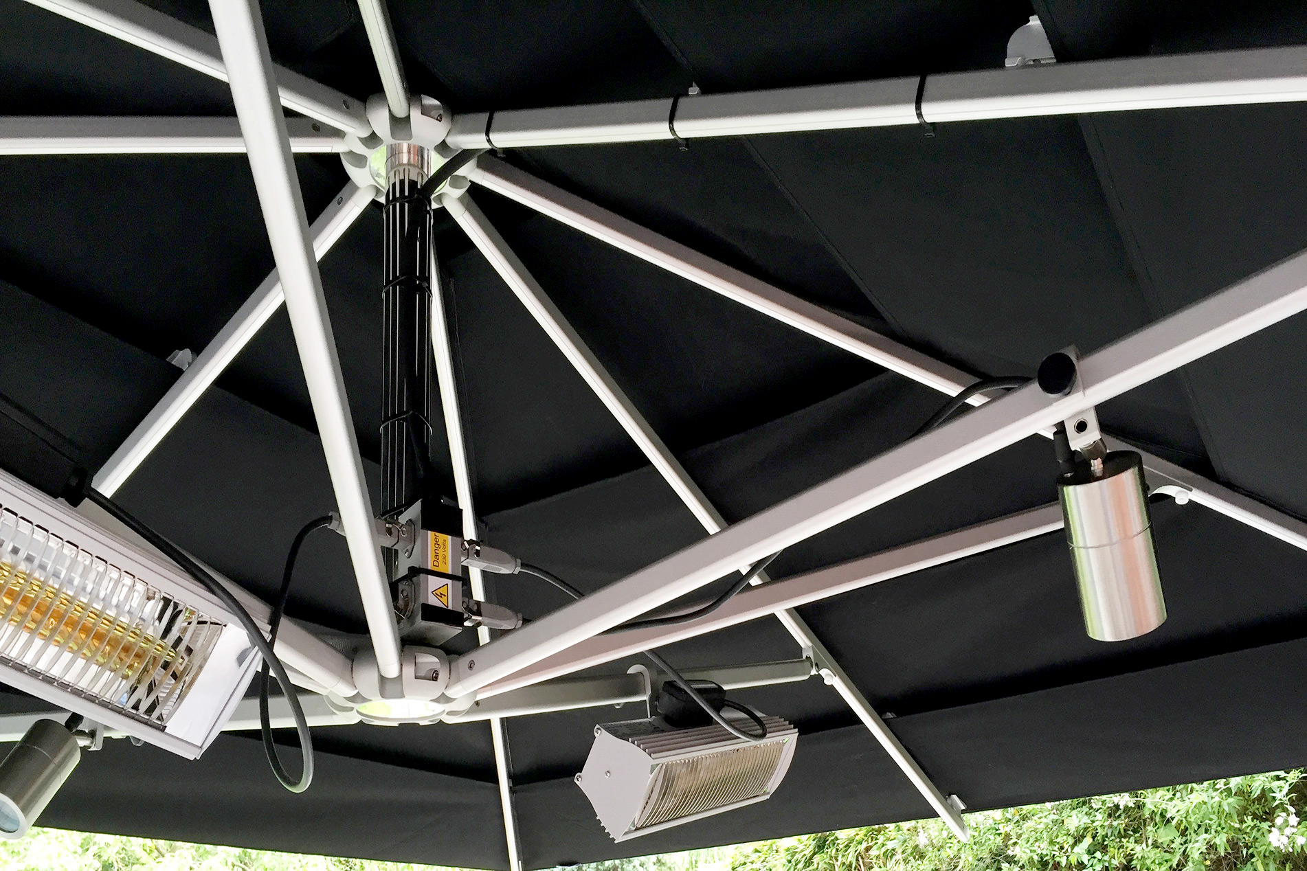 We also provide our Smart Hubs designed for use on all our parasols which enable ONE electrical supply cable (which we provide) to feed up to 4 radiant heaters and a set of LED lights. Each of our heaters is manufactured using specially coded safety plugs, custom brackets and painted to our chosen paint RAL. They can be attached or detached from the parasol within minutes. LEDs can be supplied as detachable stainless 240V spot lamps with custom brackets and coded plugs or as strip lights within the main arms for plain canopies only. Our Smart Hubs are a safe and efficient solution to heating and adding light to your parasol.